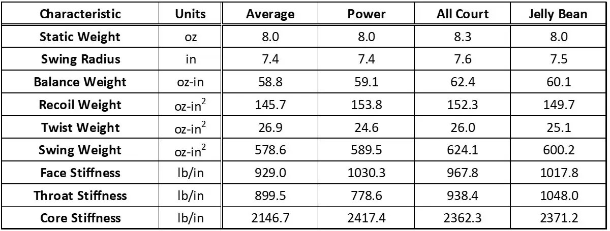 Curiously, the USAP official test results for the 11SIX24 paddles shows that PBCoR of the Power paddle is 0.39, whereas the PBCoR of the All Court and Jelly Bean paddles have a higher PBCoR 0.41. This result is counter-intuitive because it indicates that both the All Court and Jelly Bean paddles have greater reactivity (or power) than the Power paddle. Numerous skilled players have compared the 11SIX24 paddles and all agree that the Power paddle has more power and spin capability than either the All Court or Jelly Bean paddles. It is unclear why the USAP PBCoR test does not correlate with our modal impulse tests or with player experience.
